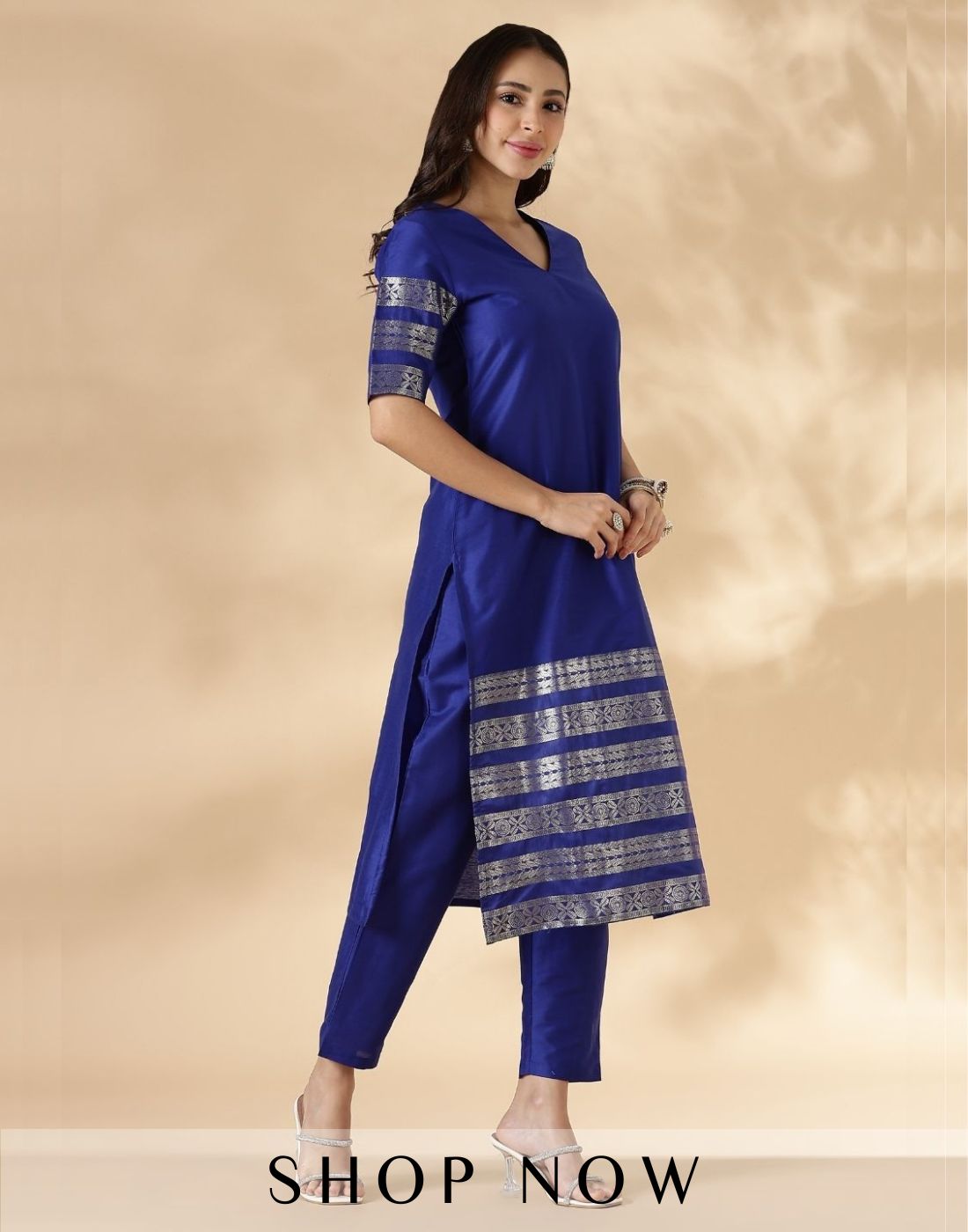 Banarasi zari Yoke high-low kurta with Fuschia pink pathani pants