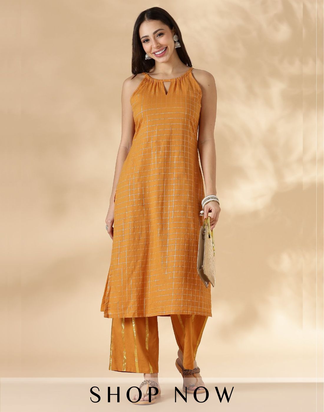 Mustard Halterneck Lurex Kurta with Straight Pants