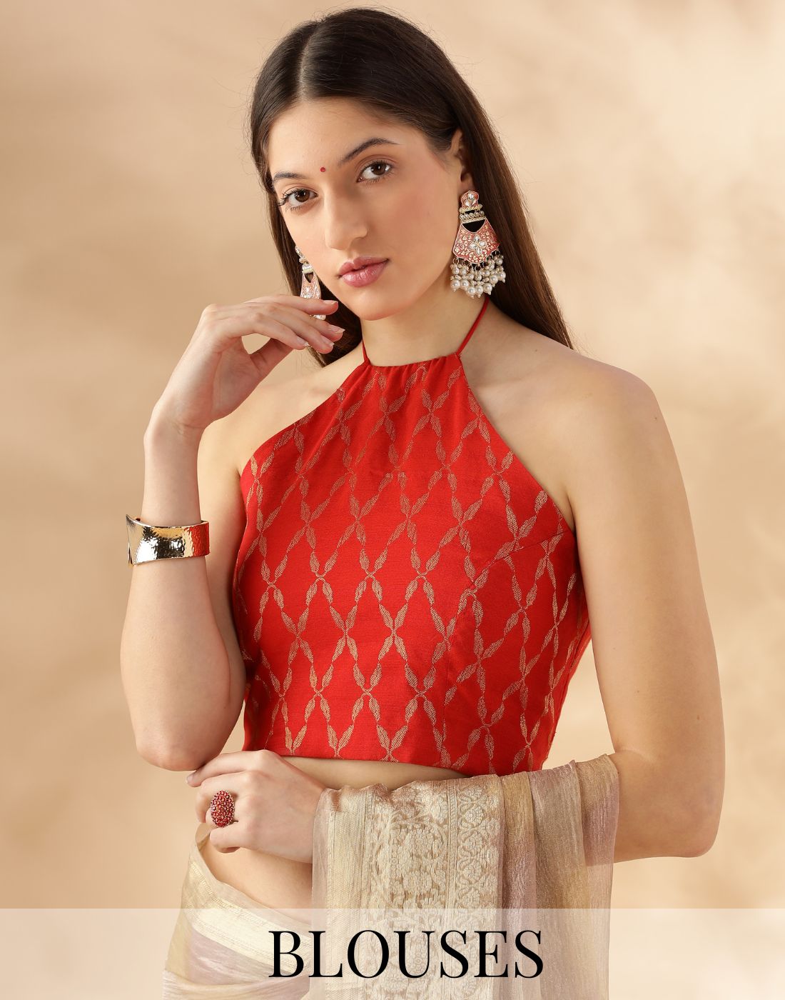 Rust Orange V Neck Kurta with Brocade Accent and Balloon Sleeves