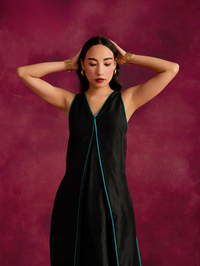 This banarasi cotton viscose kurta set has a V-neckline, side-slits and an inverted pleat at the front edged with a contrast colored pin-piping. The eye-catching detail of this kurta is its back tie-up which makes it adjustable around the chest and the waist which is also elasticated at the back. The kurta is fully lined with cotton to add comfort and elegance in your occasion wear. The kurta is paired with contemporary pathani pants which is elasticated at the waist and has side pockets.
