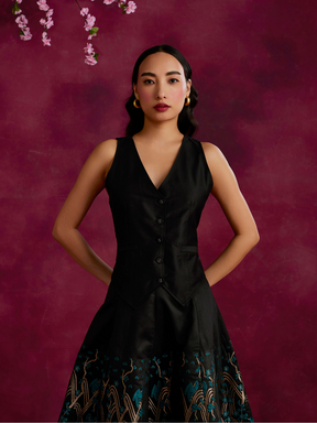 This banarasi cotton viscose midi-length panelled skirt has a side zip opening. The skirt is curated with a beautiful zari design having japanese motifs of oriental clouds, crane and florals like kiku, ume & sakuras. The skirt is fully lined with cotton to add comfort and elegance in your occasion wear.