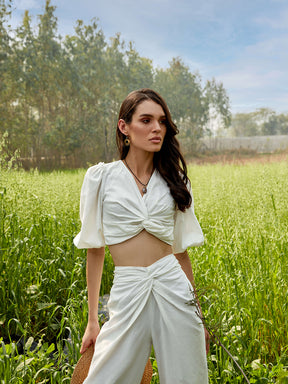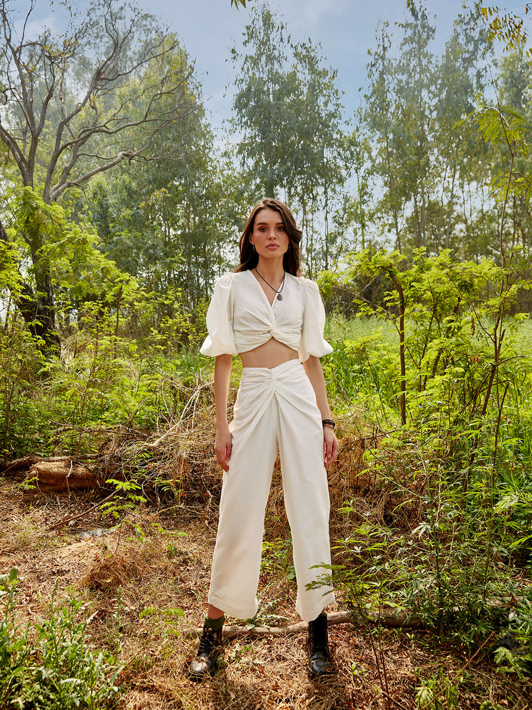 A timeless outfit for any occasion features a knotted top and bottom. The Pearly Co-ord set comprises a top that is anything but basic and is exquisite and sporting puffed sleeves along with straight-leg pants sitting high on waist.
